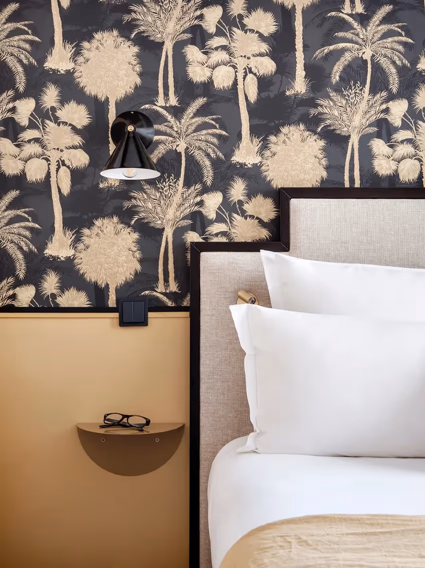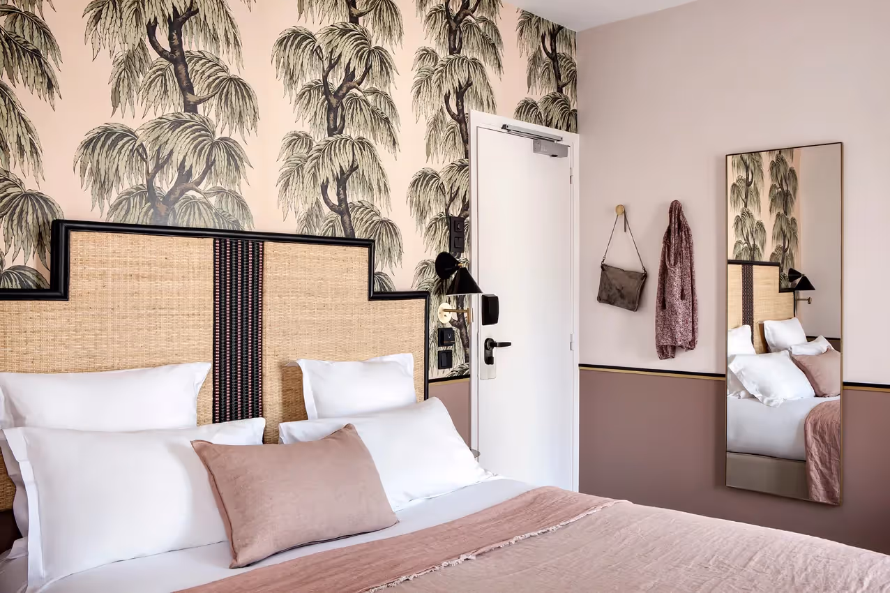 La chambre "Deluxe Palm" à l'hôtel Doisy vous plonge dans une parenthèse de détente à l'abri de l'effervescence parisienne. Profitez d'une expérience cocooning avec un lit King ou twin, plateau de courtoisie, table et fer à repasser, douche ou baignoire, climatisation, minibar, télévision à écran plat, penderie, literie de qualité, sèche-cheveux, et coffre-fort. Chaque détail contribue à rendre votre séjour élégant et mémorable à Paris.