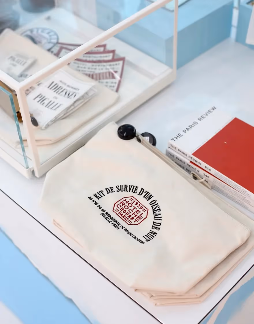 On a ramené tous les meilleurs souvenirs de Pigalle au Bon Marché Rive Gauche. Le très iconique Kit de l’oiseau de nuit (préservatifs et bouchons d’oreilles, brosse à dent en bois et trousse de toilette en coton épais), le peignoir et les chaussons Rochechouart. Une nuit chez vous comme à l’hôtel.